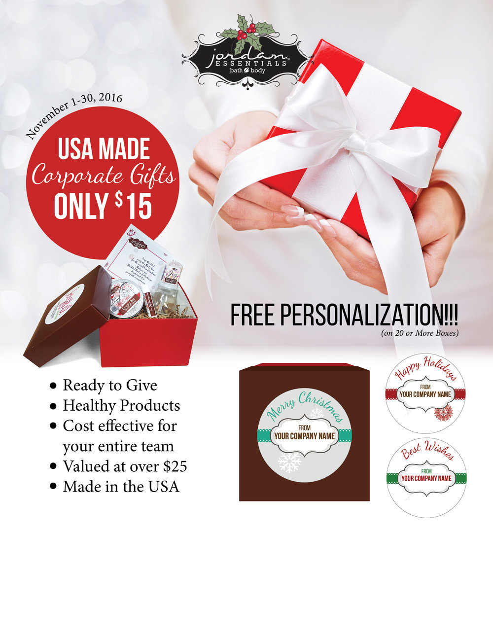 It’s the season of giving and you have some great people you work with and you want something special, unique and yet have a budget.  Jordan Essentials Joyful Jordan Box to the rescue. Each month a thoughtful collection is created and placed in a beautiful box ready for gift giving for only $15!  The value is always over $18 and can reach up to $40 or more depending on the month. The collection is only available for one month so you do have to act quickly and decide if you want this month’s box or wait for next month to come out. Want to make it personal? Order 20 or more and we will add a special label and message to the top of the box making you the best boss in the world! You can feel good about your Joyful Jordan box because it is also made from healthy non toxic skin care products everyone likes and needs and is made in the USA!  Win Win! Order your Joyful Jordan  boxes today and if you order over 20 you will need to e mail us for that custom label at www.customercare@jordanessentials.com We ship quick too!  Your order will be ready to go in just 5 business days plus ship time.  Plan ahead for this busy season and let our elves help you and your corporate gift giving today!
